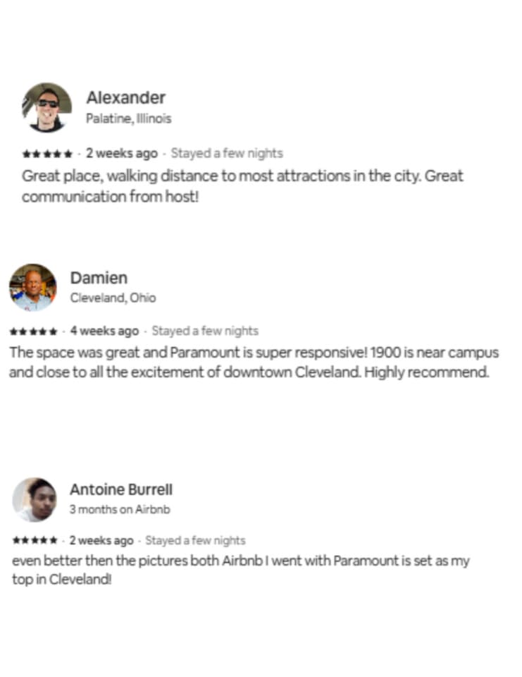 Welcome to the heartbeat of Cleveland! Our neighborhood seamlessly blends urban vibrancy with lakeside tranquility. Effortless Explorations: - Sports Enthusiasts': Enjoy our proximity to the city's iconic stadiums, where energy and passion for the game reverberate through the air. - Entertainment Galore: Indulge in excitement at the Playhouse Square, offering hours of entertainment. - Nature's Retreat: Nature lovers can take leisurely strolls by Lake Erie's picturesque shores, providing a serene backdrop amidst the city hustle. - Culinary Delights: Around the corner, a myriad of dining options await, from gourmet restaurants to cozy local eateries, catering to every palate. - Hassle-Free Parking: The convenience of nearby parking garages ensures a hassle-free experience for our driving guests. Dive into the best of both worlds – an urban adventure and a lakeside retreat, right here in our vibrant neighborhood.